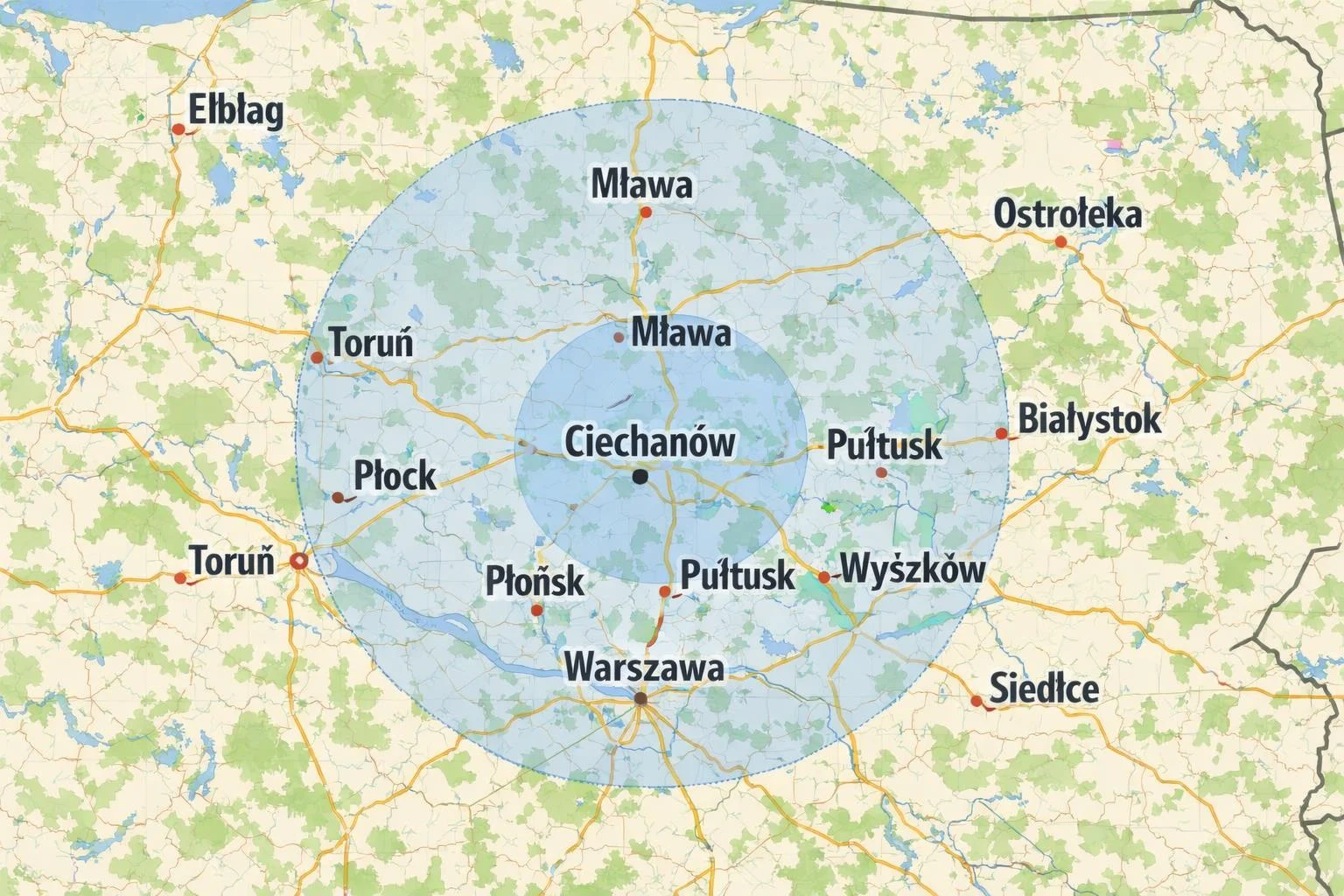 Warsaw, Ciechanów, Mława, Płońsk, Pułtusk, Wyszków, Płock, Ostrołęka, and Siedlce.